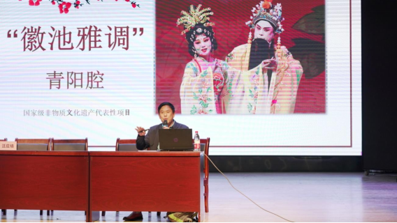 本次传唱教学活动分两个部分进行。汪应培馆长首先从青阳腔的由来、青阳腔的传播以及青阳腔的历史贡献向在座的师生们普及了国家级非遗的基本知识,随后播放了他们选送中央电视台戏剧频道2019年春节联欢晚会的现场版青阳腔经典剧目——《情到马嵬》。