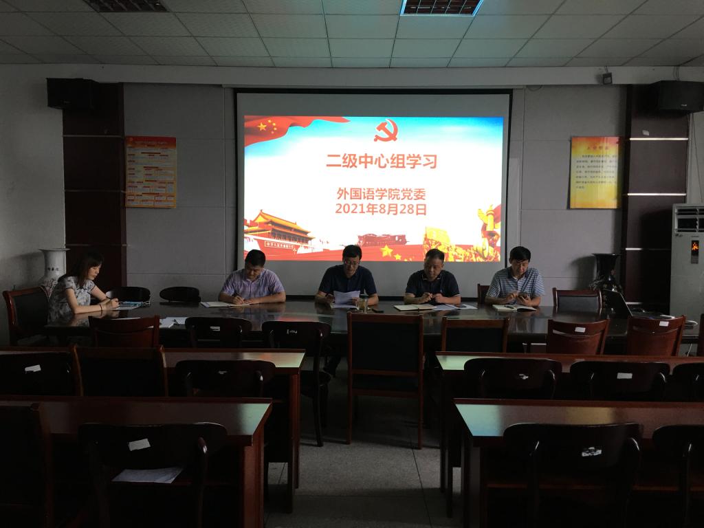 828日下午,外国语学院在会议室举行党委中心组集中学习。外国语学院党委成员、各支部书记参加了学习。会议由院党委书记张乐民主持。