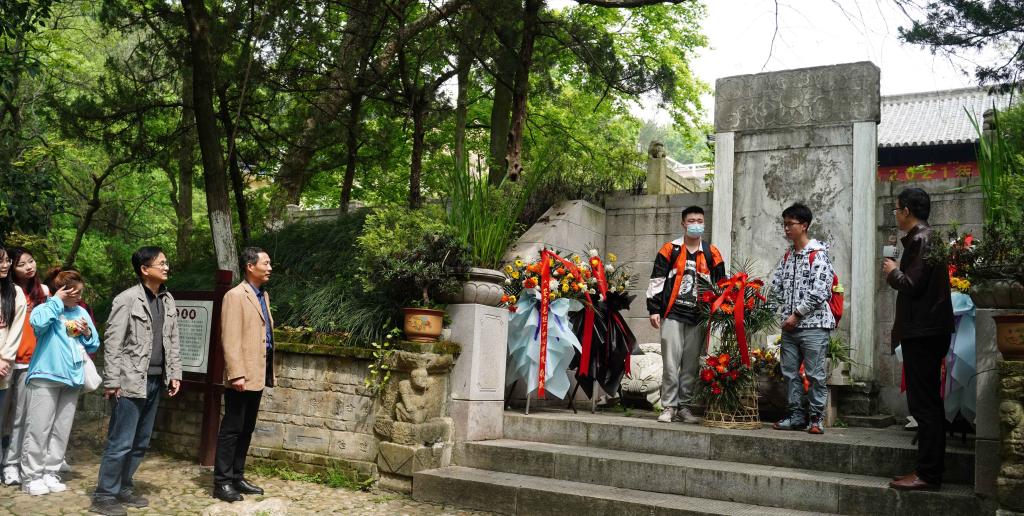 上午,在潜山市城区皖光苑的张恨水墓前,谢家顺介绍了张恨水生平和墓园情况。师生们向张恨水铜像敬献了花篮,刘光明代表师生整理了花篮绶带,大家面向张恨水铜像三鞠躬,表达了对一代小说大家张恨水先生的敬仰与缅怀之情。