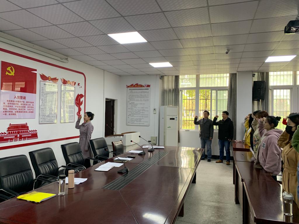 在张鑫带领下,全体党员起立,面对党旗,紧握右拳,庄严宣誓。随后,新党员代表王倩倩表示,要不断提升自己的思想政治修养,加深对党的方针政策的认识和理解,充分发挥党员的先锋模范作用,利用自己的科学文化知识更好地服务人民、奉献社会。