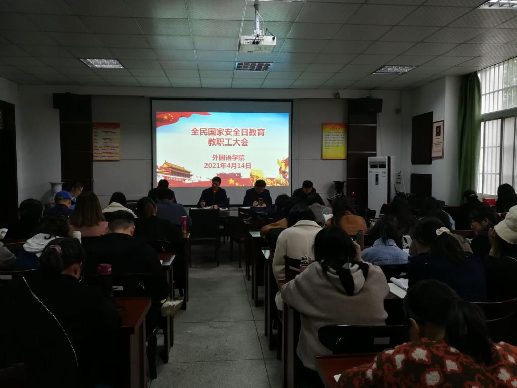 4月14日下午,外国语学院分别召开教职工大会和学生工作例会,布置“全民国家安全教育日”活动安排。会议要求外国语学院全体师生要积极参与各项活动,各班辅导员要做好引导,落实责任要求。会上,外国语学院党委书记张乐民从国家安全教育日设立的概况、国家安全基本知识、真实案例等方面为教职工上了一堂国家安全教育日主题党课。