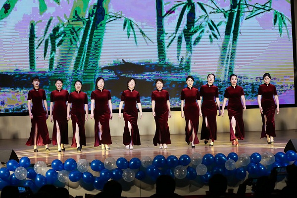 晚会在一曲动感舞蹈《Maria》中拉开了帷幕,精心的编排、惊艳的舞姿洋溢着热烈的青春气息,也点燃了观众的热情之火。传统乐器二胡与流行歌曲的碰撞、充满古典韵味的扇子舞、优雅浪漫的华尔兹、富有活力的拉丁舞无一不展现着学院学子的艺术修养和积极向上的精神风貌;茶艺表演《云开照萬川》展现了中国茶文化的博大精深;相声《新语新说》串讲日常生活用语,风趣幽默,在欢声笑语中阐释着中国语言文化的独特魅力;话剧《疫中人》刻画还原了新冠疫情期间学院师生的学习工作状态,重现了众志成城抗击疫情的英勇壮举;学院党委共建单位——杨安社区带来的独唱《小白杨》和黄梅戏《春蚕到死丝不断》更是声情并茂;学院18位女教师带来的绝世风雅的旗袍秀,强大的阵容,曼妙的身姿,优雅的仪态,瞬间点燃了观众的激情,也将晚会推向了高潮。