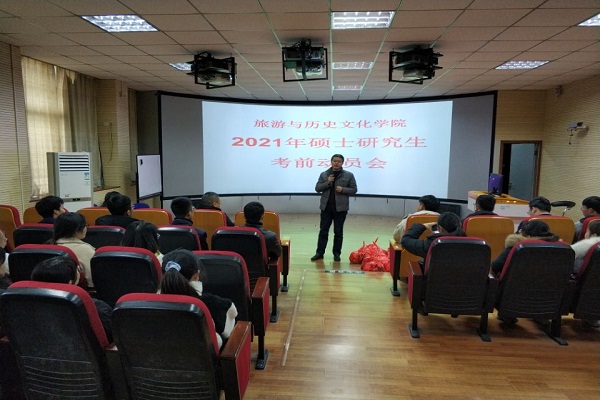 为了给学院全体参加考研的同学们加油鼓劲,擂响考研学子出征的战鼓,12月18日下午,旅游与历史文化学院在博雅楼四楼导模教室召开了2021年研究生入学考试考前鼓劲会。学院院长胡文海教授、党委副书记桂百桢以及毕业班辅导员、2017级考研学子共计80余人参加了本次活动。活动由学院副院长肖宁生主持。