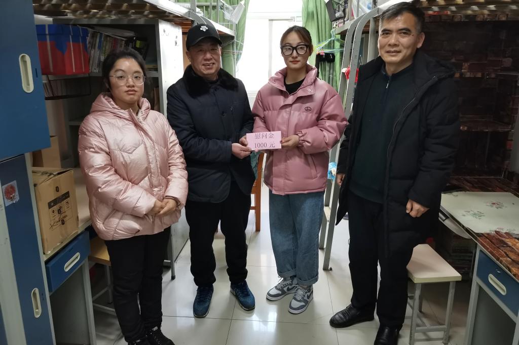 1月14日,体育学院党委书记汪思华、副书记(副院长)汪海滨一行慰问了家庭困难学生党员2017级社会体育指导与管理一班李茜,为她送去新年的问候及祝福,并送上慰问金。