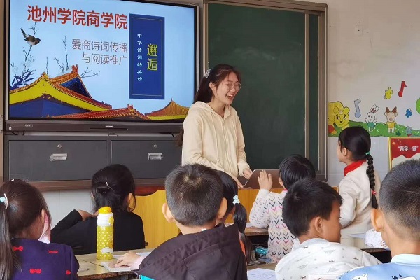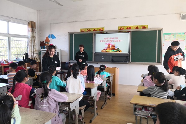 诗词传播活动中,志愿服务团带领小学生开展“励志诗词学习”活动。通过诗词旅行,感受祖国大好河山,培养孩子们的爱国情;通过讲述诗词趣事,励志诗词学习,激发留守儿童对诗词的兴趣,引导留守儿童在学习和生活中应用诗词,从诗词中汲取力量。课堂上,孩子们眨着一双双渴求知识的眼睛,积极讨论、抢答问题,师生亲密互动、气氛非常活跃。