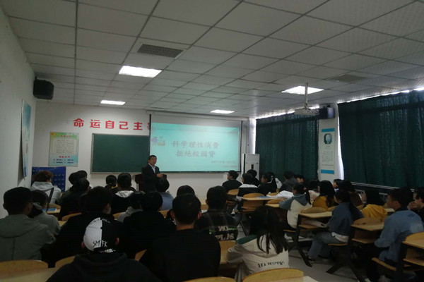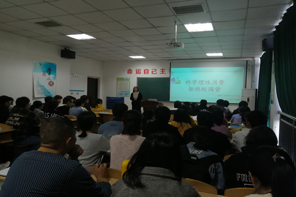 何贵林发表讲话,希望广大同学通过此次主题班会课,进一步受到启发,树立科学消费观,做一名普法小卫士;希望各辅导员进一步加强“校园贷”教育,提高同学们安全防范意识,共创文明和谐校园。