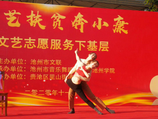 为深入学习贯彻习近平新时代中国特色社会主义思想和党的十九届五中全会精神,学习贯彻习近平总书记关于文艺工作的重要论述,11月10日,艺术与教育学院开展了“文艺扶贫奔小康”文艺志愿服务基层慰问演出活动,走进贵池区里山街道元四章。此次演出活动旨在展示脱贫攻坚新面貌,活跃群众文化生活。艺术与教育学院和市音乐舞蹈家协会共同精心策划、编排了这台文艺演出,为元四章的父老乡亲奉上一道“精神大餐”。