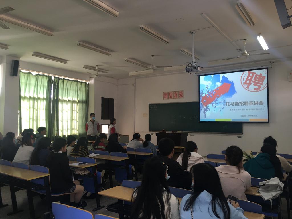 为进一步推进外国语学院2021届毕业生就业工作,帮助毕业生找到合适的工作,外国语学院积极联系用人单位,11月11日下午,外国语学院在博学南404教室举行托马斯教育专场招聘会。外国语学院2021届共有近60多位学生参加了此次招聘会。