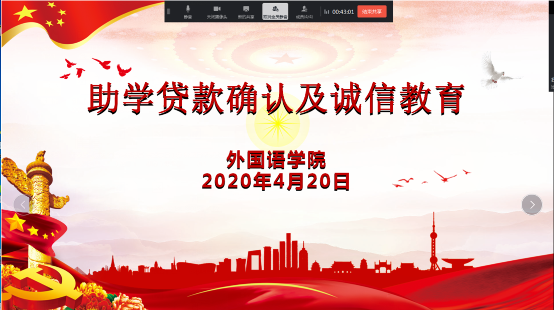 4月20日下午,外国语学院通过钉钉视频会议开展了2020届生源地助学贷款毕业确认及诚信感恩教育活动。外国语学院52名2020届生源地助学贷款毕业生全部参加会议。会议由外国语学院党委副书记刘军主持。