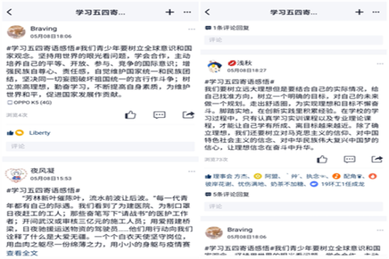 此次活动秉持“弘扬五四精神,讴歌时代力量”的理念,以展现当代大学生“继往开来、努力进取、创新求实”的时代精神为主旨,以“学习寄语精神,勇于责任担当”为主要内容,要求同学们在线上平台发表学习“五四寄语”的体会与感想。