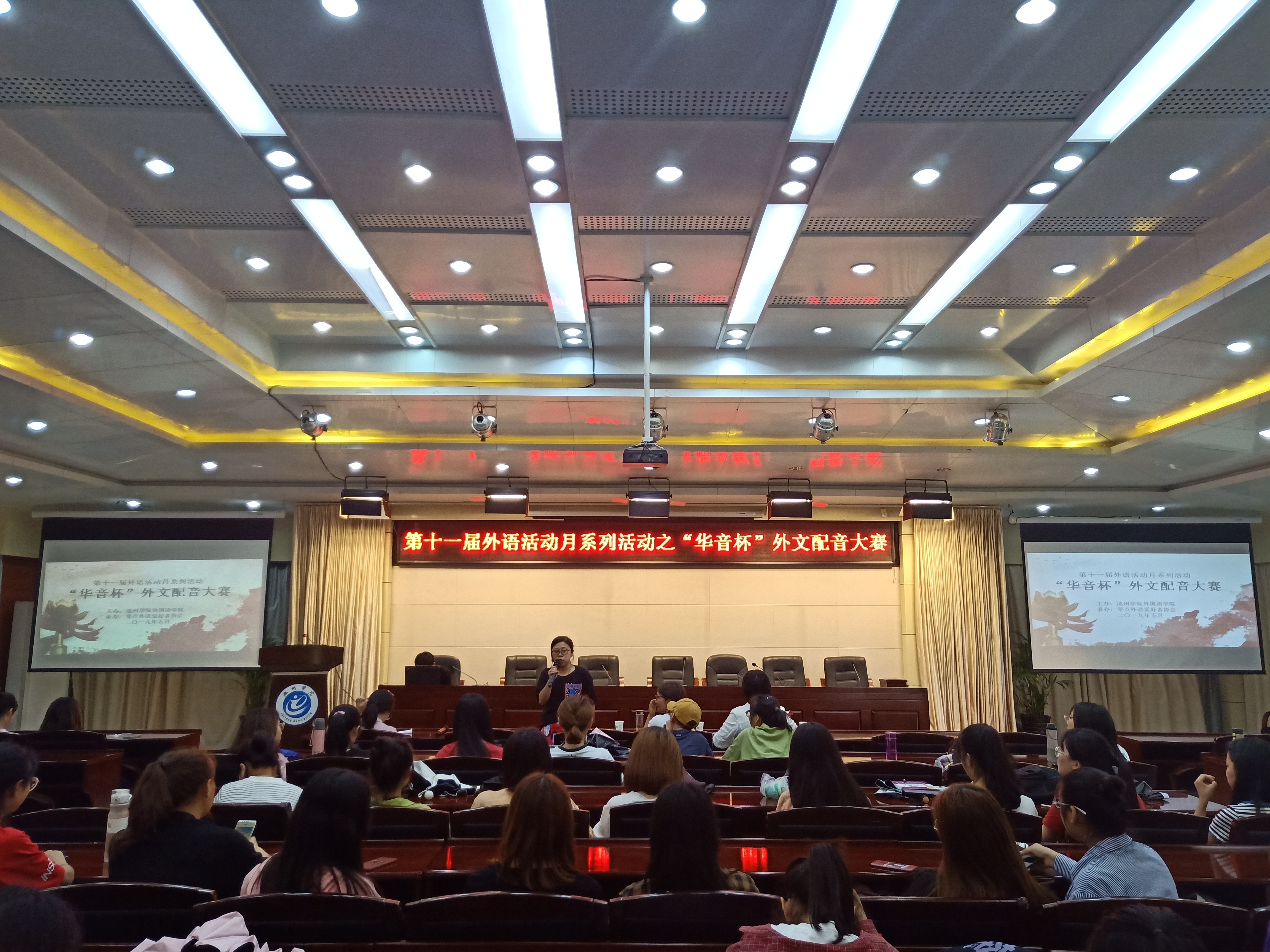 为培养学生学习英语的兴趣,提高学生英语口语表达能力和语言素养。5月30日下午,外国语学院在行政楼南二楼会议室举办了第十一届“外语活动月”系列活动之“华音杯”外文配音大赛决赛。外国语学院专业教师刘翠萍、高扬、宋婷担任本次大赛的评委,来自各个学院的100余名学生观看了比赛。