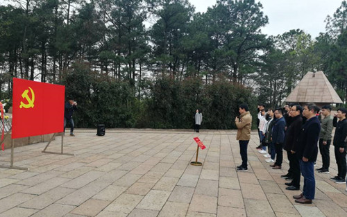 全体党员怀着崇敬的心情在烈士纪念碑前肃立,奏唱《中华人民共和国国歌》、敬献花篮、面向革命先烈默哀、鞠躬,表达对先烈的崇高敬意。全体党员面对鲜红的党旗,庄严举起右拳,重温入党誓词,不忘初心、坚定信念、奋力拼搏。