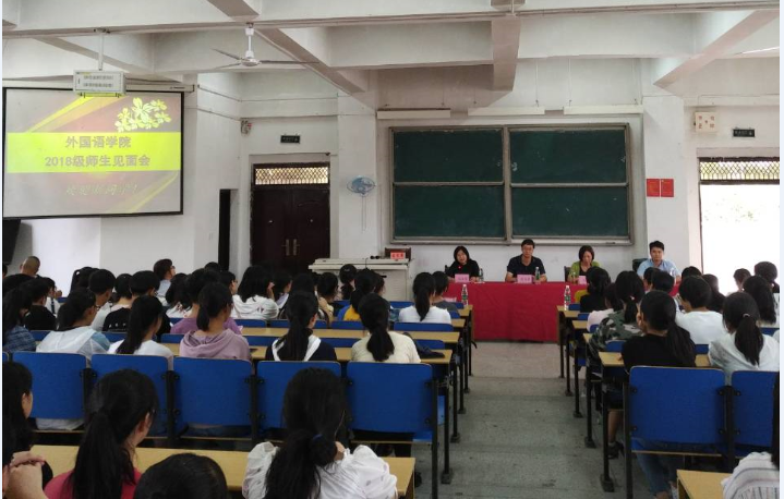 新学期,新愿景,9月10日下午,外国语学院在博弈一楼阶梯教室举行2018级师生见面会。院党政班子、行政人员、教研室主任、18级授课教师、辅导员及18级全体新生参会,会议由党总支副书记冯淑慧主持。