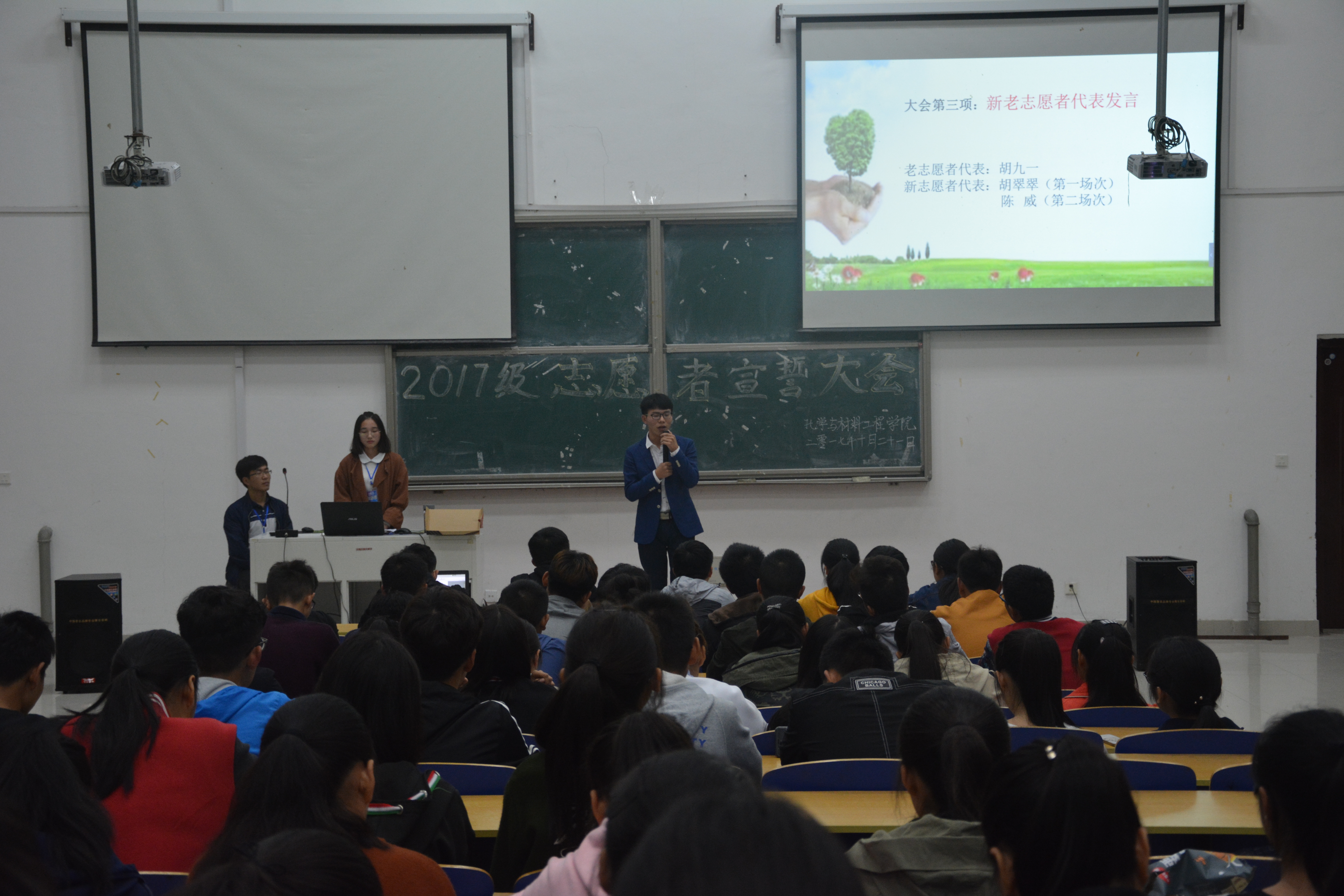 为更好地深化志愿活动,进一步加强志愿队伍的组织建设和规范管理。1021日晚,化学与材料工程学院于逸夫楼阶梯教室举行2017级新生志愿者宣誓大会,化材学院全体新生参加了本次活动,会议由化材学院青协分会负责人佘春莹主持