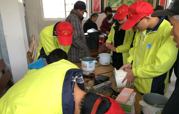 志愿者们来到了敬老院活动中心,分为三组进行分工合作。电气维修组帮老人们维修电饭煲、收音机;另外一组学生和老人们亲切的交谈了起来,询问老人们的生活情况,给予他们最美好的祝愿;表演组的同学们为老人们带来了自编自演的精彩节目,整个敬老院都沉浸在温馨的气氛中。活动最后,老人和志愿者们合影留恋。