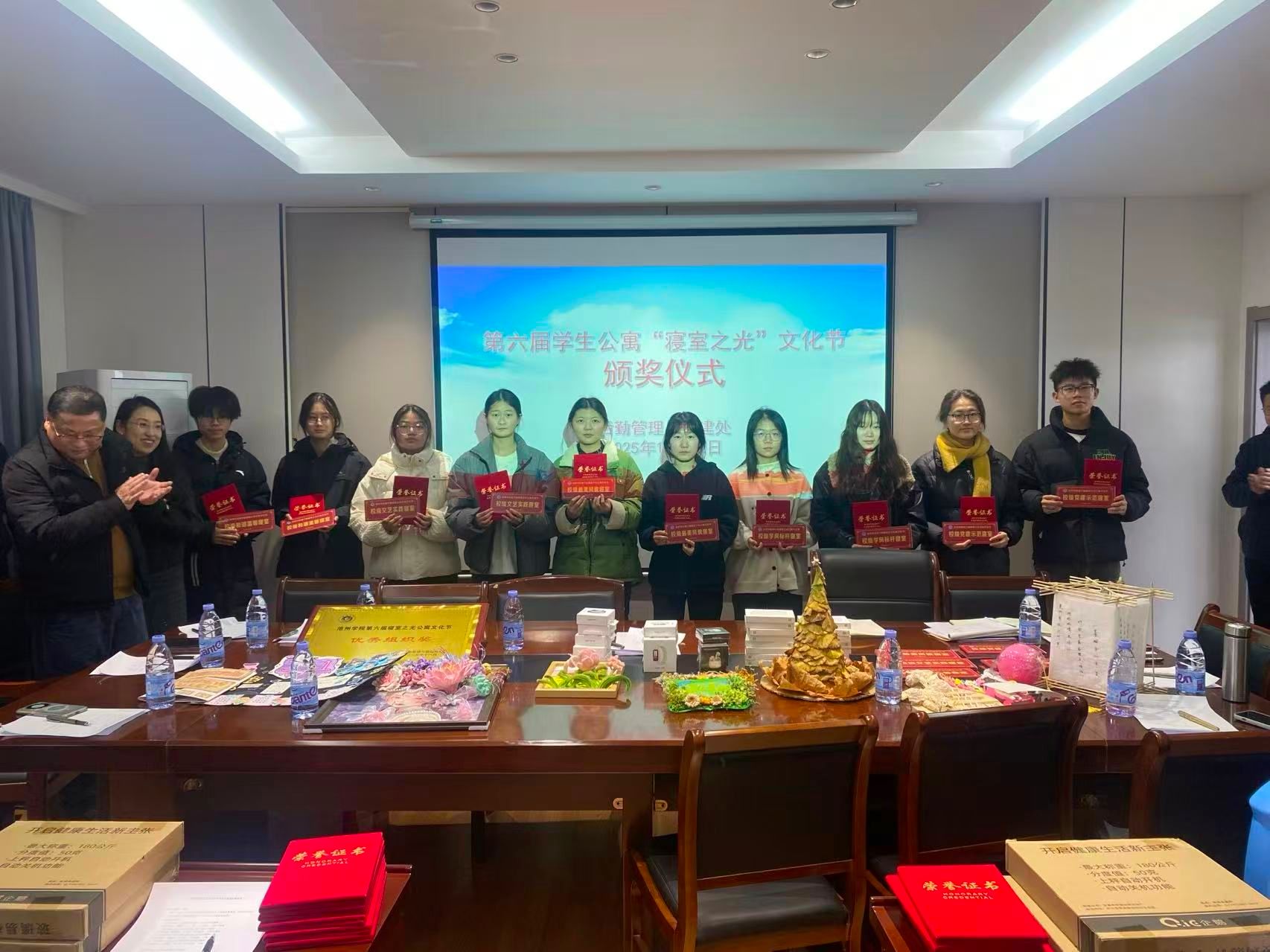 为提升学生文明素养,推进寝室文化建设,营造美好生活空间,学校于2025年11月组织开展了第六届学生公寓“寝室之光”文化艺术节。为总结成果、表彰先进,2025年12月12日下午,颁奖活动在后勤管理与基建处会议室举行。各二级学院分管学生工作副书记、获奖师生代表、宿管员代表等50余人参加。活动由后勤管理与基建处处长张甫彬主持。