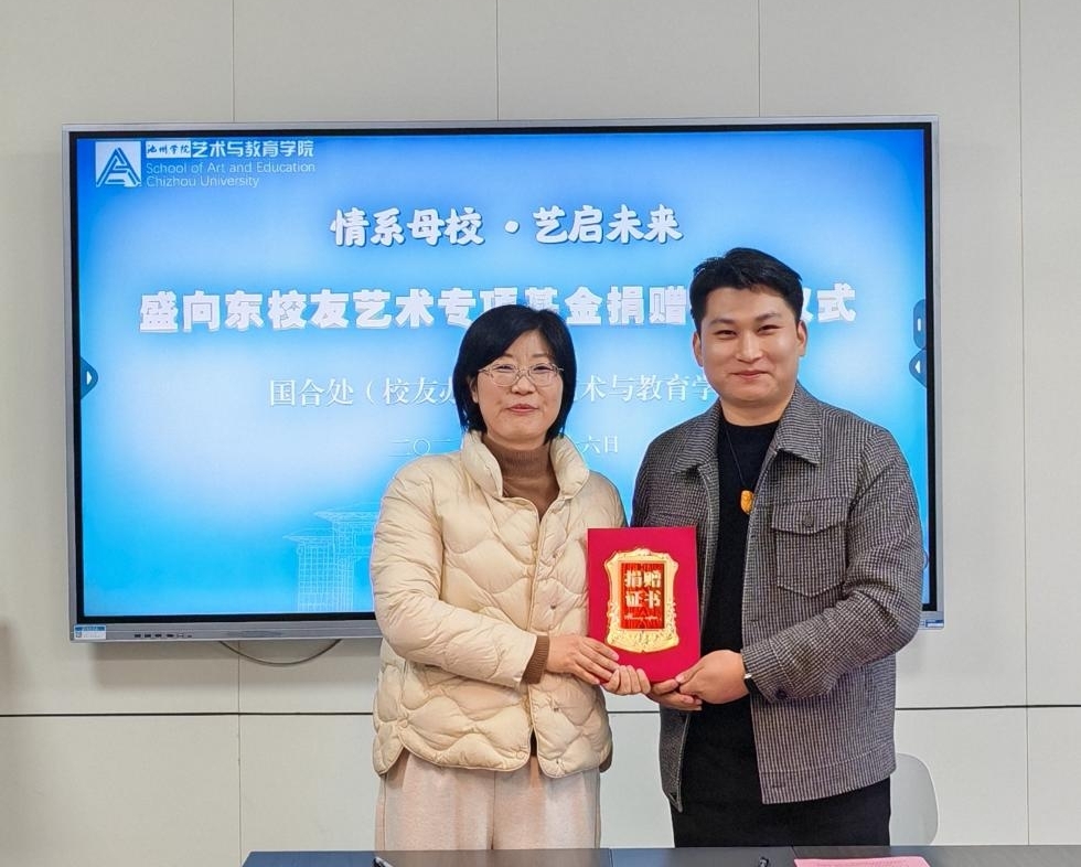 在全体与会人员的见证下,盛向东校友与学校代表徐菲共同签署捐赠协议,并合影留念。该基金将专项用于奖励艺术与教育学院学生在各类艺术比赛中取得的优异成绩,旨在激发学生创作热情,提升专业水平。
