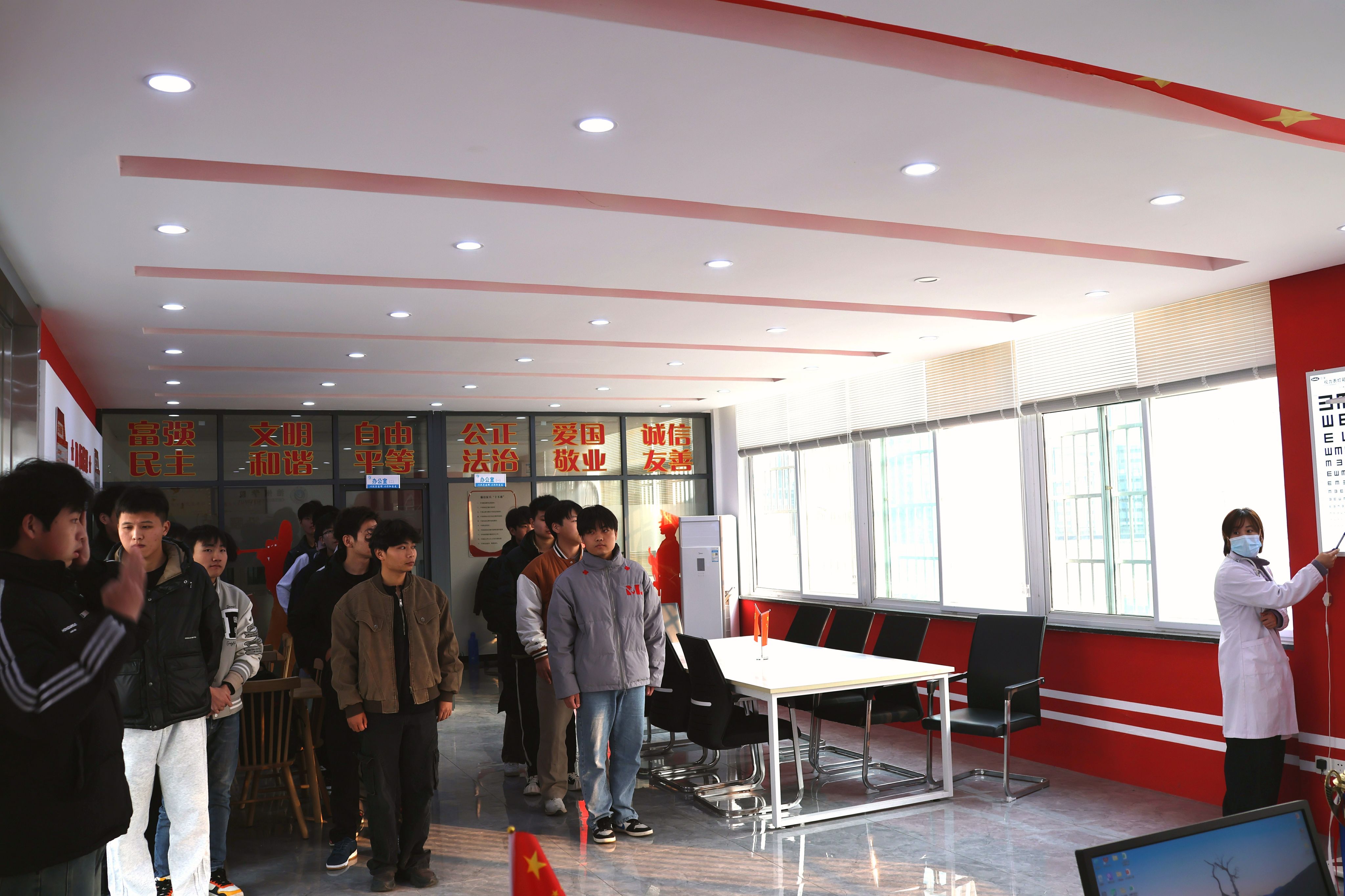 初检现场,校医务室负责人严格遵循《应征公民体格检查标准》及最新征兵体检规范,秉持“公平、公正、严谨、细致”原则,逐项检测应征青年身高、体重、视力、听力、行动能力等基础指标,细致询问既往病史,全面筛查健康状况,确保检测无盲区、把关无漏洞。医护人员精准记录核对数据,耐心解答青年关于体检标准、流程的疑问,让大家清晰知晓相关要求与后续安排。