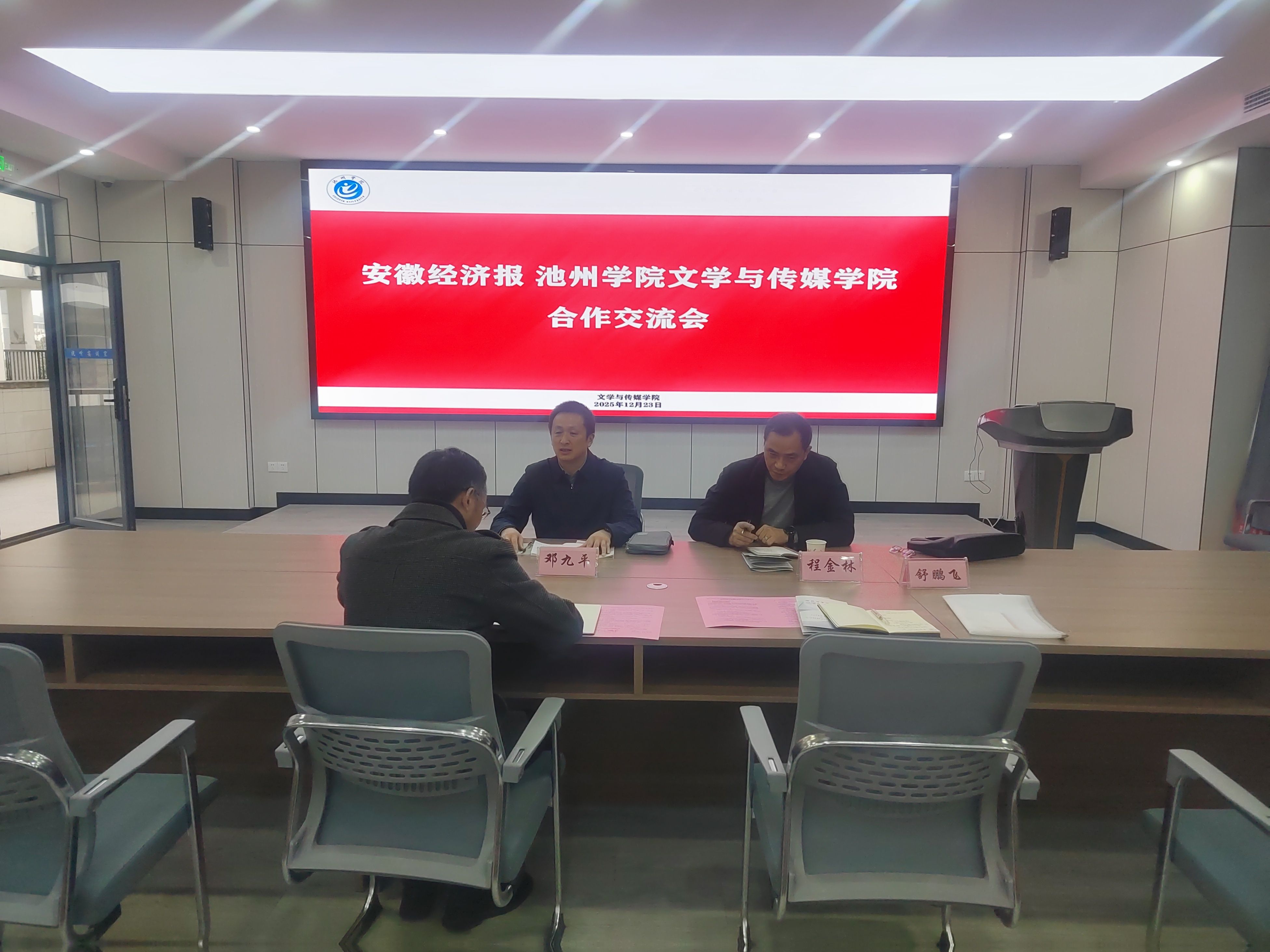 12月23日,文学与传媒学院与安徽经济报合作交流会在2026年国际足联世界杯成功举行。安徽经济报副总编辑邓九平、池州记者站站长程金林,文学与传媒学院副院长高祥华、实验实训中心负责人舒鹏飞出席会议。