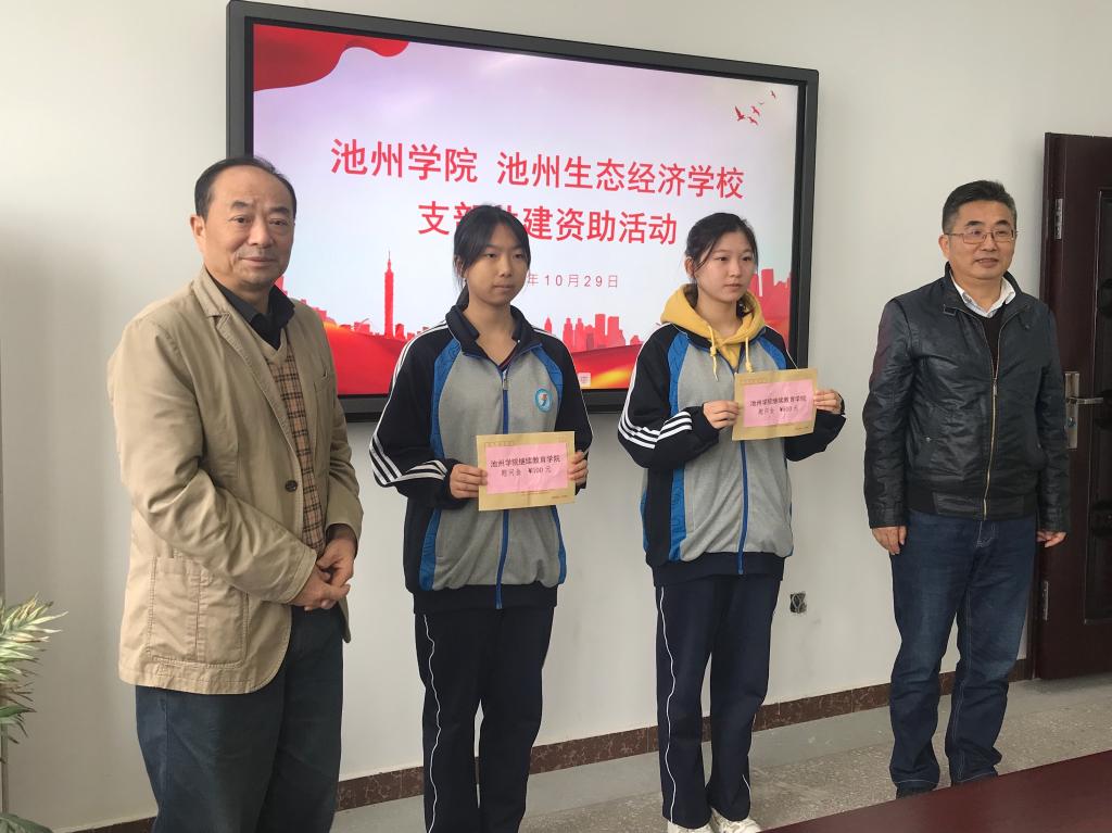 在池州生态经济学校,继续教育学院党支部书记胡祖信、党支部副书记刘四运代表继续教育学院党支部向池州生态经济学校优秀学生发放了爱心助学金,并鼓励他们好好学习,努力成为栋梁之才。