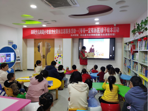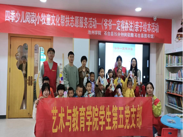 为充分发挥地方高校在推进文化惠民、文化帮扶工作,助推地方发展,营造“多读书、爱读书、读好书”的全民阅读氛围,11月5日下午,艺术与教育学院学生第五党支部师生党员,赴石台县图书馆开展了“小牧童绘本分享”志愿服务活动,党支部书记王俊华、支部委员张俊、“小牧童”志愿服务队学生党员志愿者及石台县30多名儿童和家长们参与了本次活动。