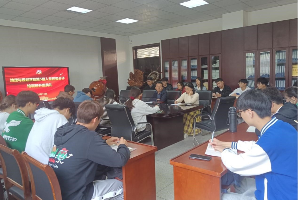 11月9日,地理与规划学院分党校第5期入党积极分子培训班开班典礼在博文南党员活动室举行。地理与规划学院党委副书记许卫兵、学生支部书记汪雨以及此次培训班的入党积极分子同学们参加了开班典礼,开班典礼由汪雨主持。