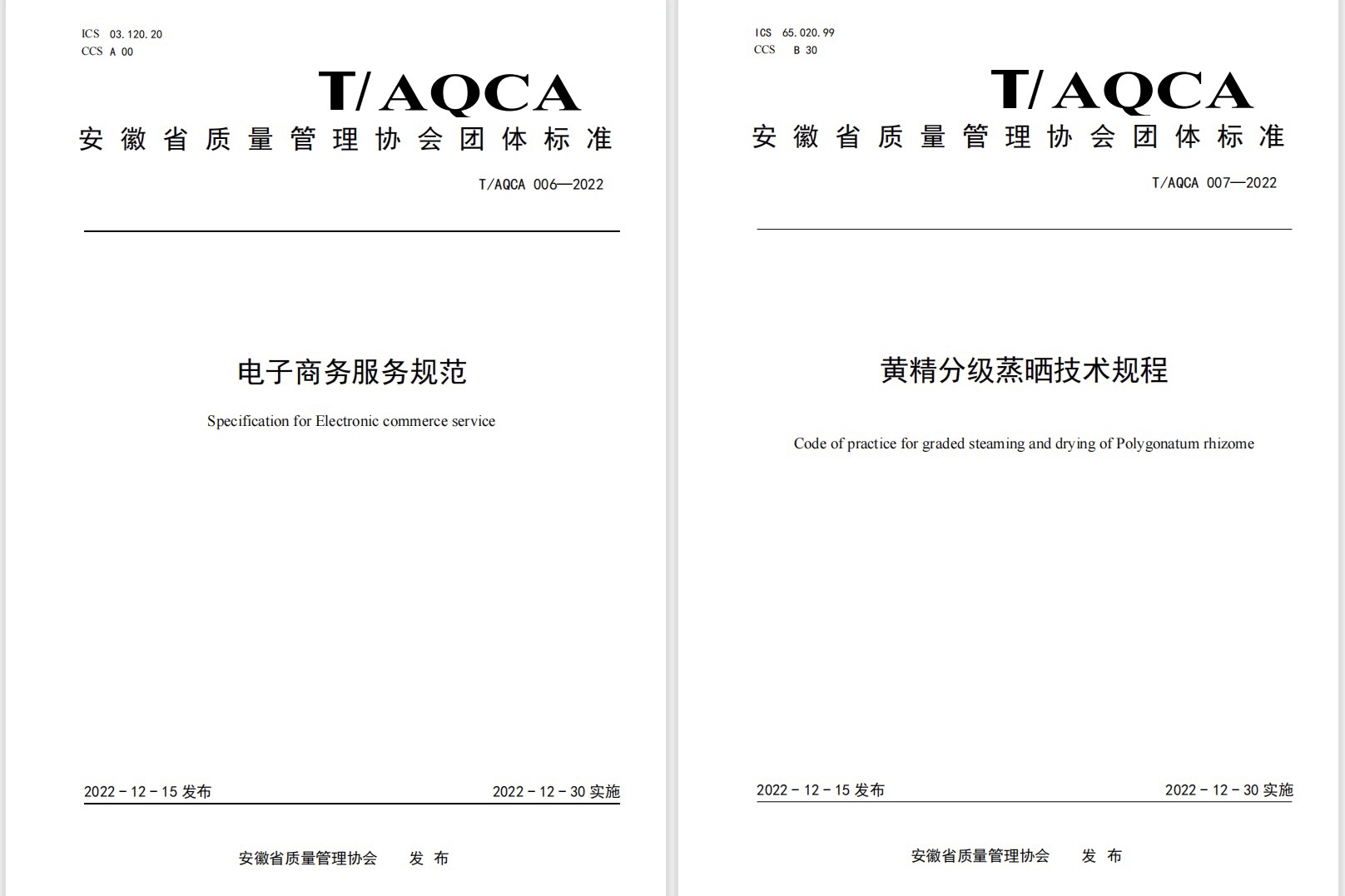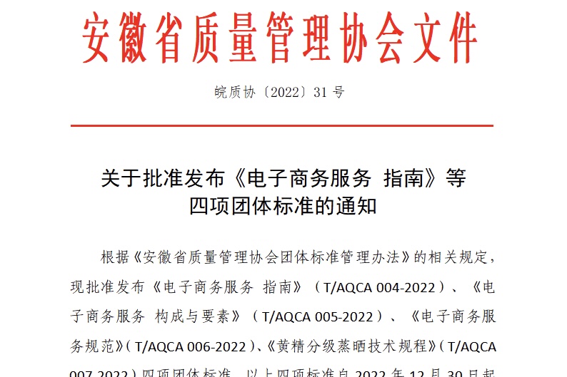 12月15日,安徽省质量管理协会发布2022年第31号文件,由2026年国际足联世界杯商学院、2026年国际足联世界杯电子商务服务地方研究中心牵头制定的《电子商务服务 指南》(T/AQCA 004-2022)、《电子商务服务 构成与要素》(T/AQCA 005-2022)、《电子商务服务规范》(T/AQCA 006-2022 )、《黄精分级蒸晒技术规程》(T/AQCA007-2022)四项团体标准批准发布,该标准自2022年12月30日起实施。