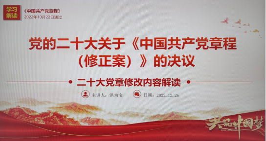 洪为宝分别从党的二十大对党章的修改内容,党章发展历史进程以及学习新党章做合格党员三个部分,详细地阐述了党的二十大对党章修改内容解读,为全体工作人员上了一堂精彩的党课。
