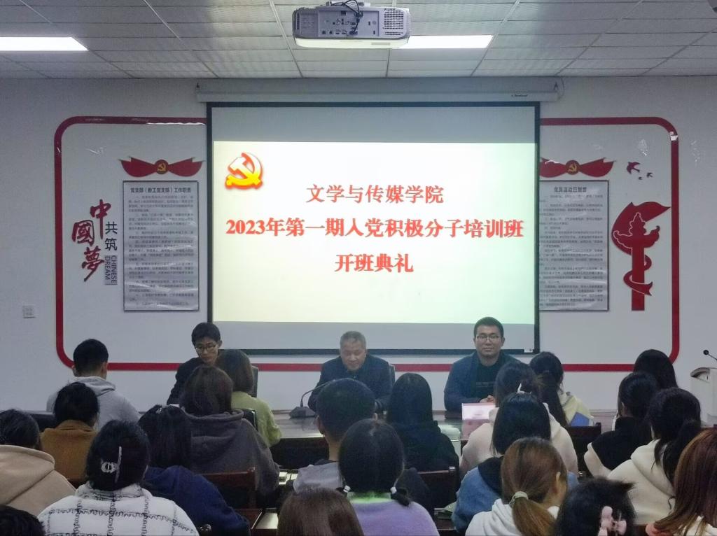 2023年4月24日,文学与传媒学院2023年第一期入党积极分子培训班开班典礼在博物楼第一楼会议室举行,院党委书记许思友、党委副书记刘德群、组织员董万红和此次接受培训的93名入党积极分子参加了开班典礼。开班典礼由刘德群主持。