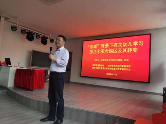 4月21日下午,安徽师范大学教育科学学院(学前教育学院)副院长、博士生导师张更立教授应邀来艺术与教育学院作主题为“‘双减’背景下有关幼儿学习的几个观念误区及其转变”的学术报告,报告会由艺术与教育学院院长魏鸿飞主持。副院长曾晓红、学前教育教研室、教育类公共课教研室全体教师、学前教育专业学生、市内部分实习基地幼儿园园长及教师聆听了报告。