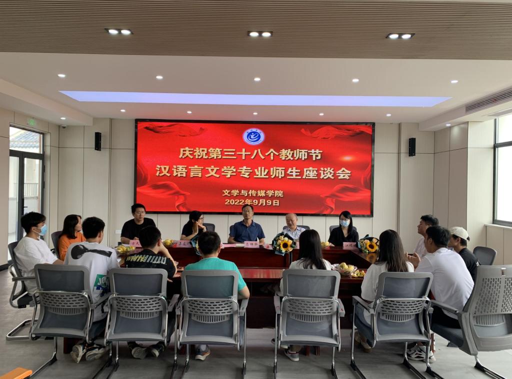 9月9日上午,文学与传媒学院在博物楼第二会议室举行“迎接党的二十大,培根铸魂育新人”庆祝第38个教师节汉语言文学专业师生代表座谈会。会议由副院长高祥华主持。教学办主任方天宝、知名教授章建文、骨干教师姜友芝、专职辅导员江娟娟、学生代表参加座谈会。