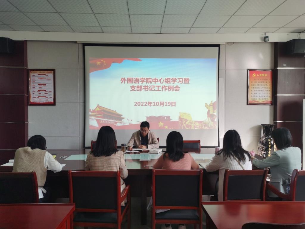 10月19日,外国语学院在会议室举行党委中心组学习暨支部书记工作例会。外国语学院党委委员及各支部书记参加了会议。会议由学院党委书记张乐民主持。