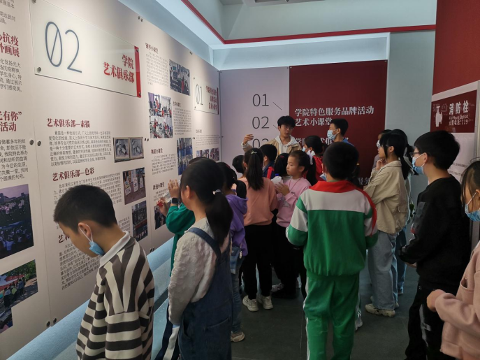 第三站为艺术教育中心。面对各式各样的文艺作品,像油画、全新的动画周边、对传统傩戏面具奇思妙想的创改……艺术与教育学院毕业生的作品展让小朋友们一次又一次发出惊叹。在讲解员的解释下,小朋友们不仅知道这些作品都是由什么材质创作而成更了解到这些作品的创作灵感来自何处。在这里,孩子们感受到文化艺术带来的温暖,体悟文化的韵味和艺术的魅力。