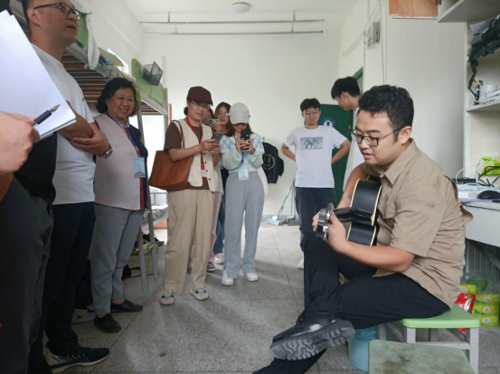 在2022级视觉传达设计专业学生寝室中看到学生在弹吉他,学生表演后,宋凌寒老师也进行了即兴表演,并赢得阵阵掌声,在这一刻,师生间的距离被瞬间拉进,师生情得到进一步升华。