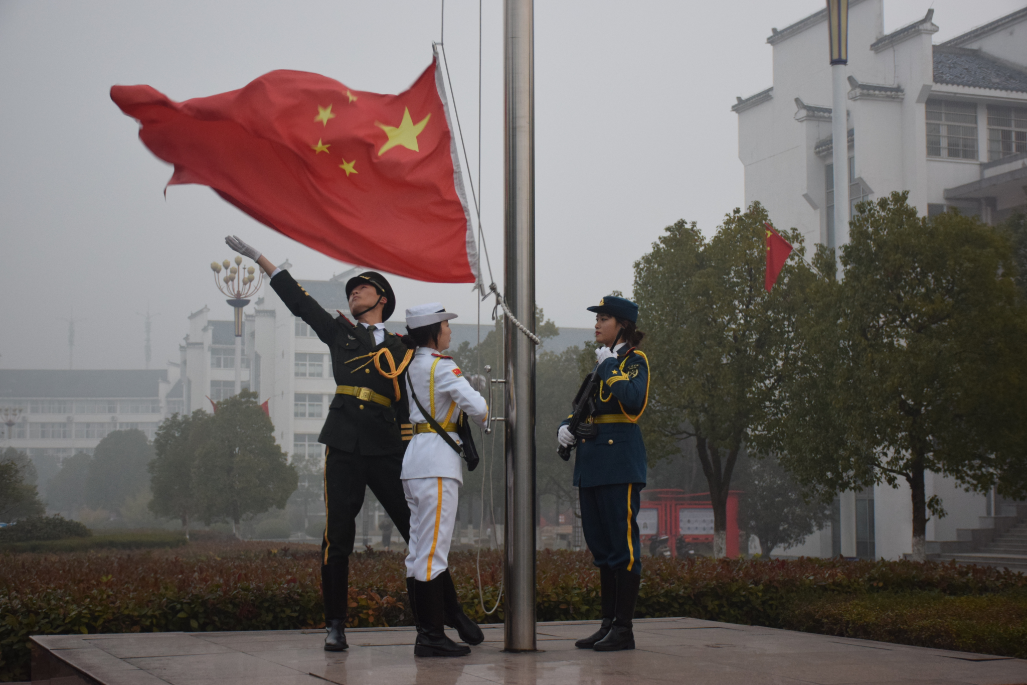 升旗台前,师生代表肃穆而立,庄严而隆重地迎接国旗飘扬时刻。随着国旗缓缓升起,师生齐声奏唱国歌,向国旗行注目礼,对伟大祖国致以崇高的敬意和美好的祝福。